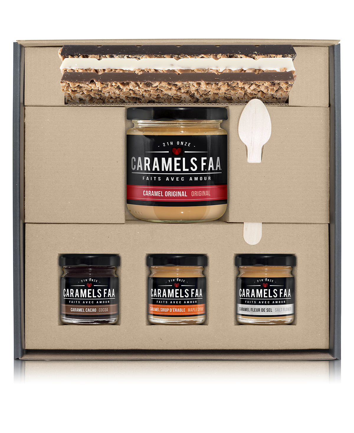Certifiée FAA Faits Avec Amour et Aliments préparés au Québec, la boîte gourmande – La Surprenante comprenant le caramel authentique du Québec est un coup de cœur assuré pour les précieux membres de votre famille!